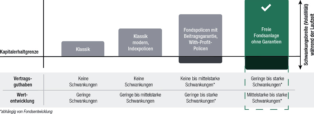 Bei Kurssteigerungen der Fonds erzielen Sie einen Wertzuwachs, bei Kursrückgängen tragen Sie allerdings auch das Risiko eines Wertverlustes. Je chancen- und risikoreicher die Fonds Ihrer Wahl investiert sind, desto stärker sind auch die möglichen Schwankungen des Fondsguthabens (sog. Volatilität). Die konkrete Wertentwicklung wird dabei von einer Reihe von Faktoren beeinflusst. Diese sind beispielsweise die Auswahl der Fonds, die Anlageentscheidungen des Fondsmanagements und letztendlich die Entwicklung der einzelnen im Fondsvermögen befindlichen Aktien- und Wertpapiertitel vor dem Hintergrund der jeweils für sie maßgeblichen Kapitalmärkte, Zinssätze, Teuerungsrate und Währungsparitäten.